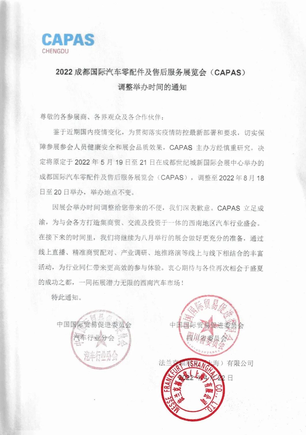 鉴于近期国内疫情变化,为贯彻落实疫情防控最新部署和要求,切实保障参展参会人员健康安全和展会品质效果,CAPAS主办方经慎重研究,决定
